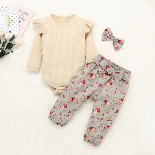 Baby Girls Beige Bodysuit & Grey Floral Trousers Set (Age Newborn -18m)