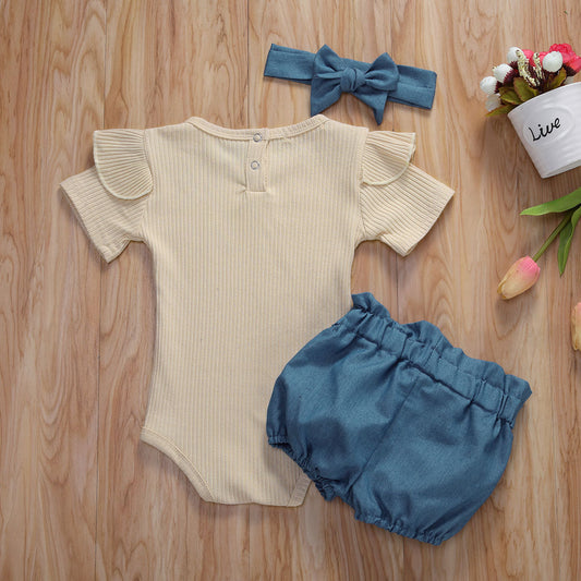 Baby Girls Beige Bodysuit Blue Shorts & Headband (Age 6M-24M)