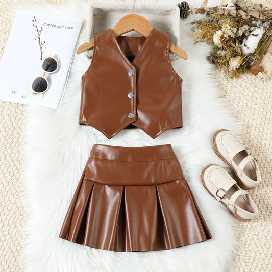 Toddler Girls Faux Leather Sleeveless Vest Top & Pleated Skirt Set (24M-6YRS)