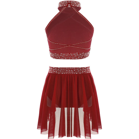 Girls Rhinestones Dance Outfit Tops & Skirt Set (Age 6-16 YRS)