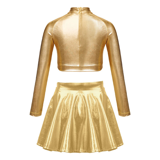 Girls Dance Metallic Long Sleeve Sequin Crop Top & Skirt (Age 6-14YRS)