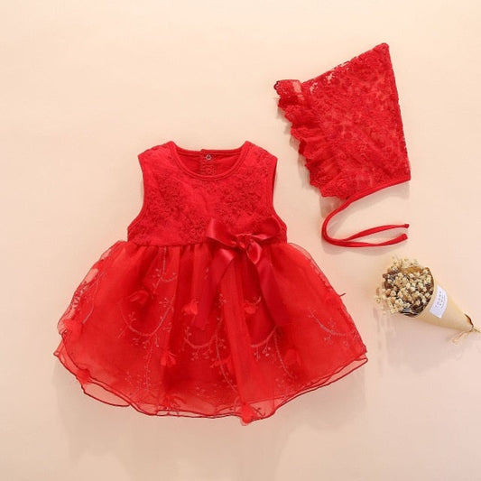 Girls Red Mesh Embroidered Dress & Bonnet Hat (Age Newborn - 12M)